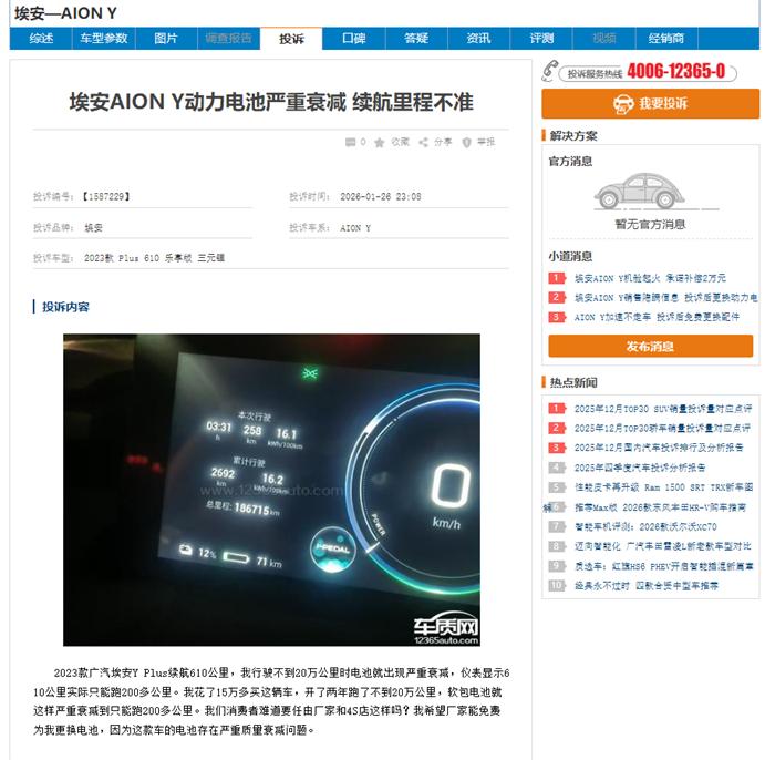 2023款埃安Y Plus,标称610续航,行驶10万公里最严重竟衰减至仅200公里左右。15万买的车,动力电池严重缩水,绝非个例。车质网也有投诉,要求厂家正视质量缺陷,免费处理车辆问题!