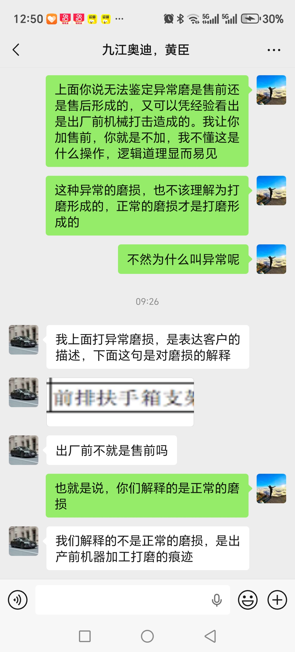 我根本没接到经销商电话,厂家也只不过是打电话来走个形式,因为已经太多次被忽悠了,所以我暂时不接电话,我会持续的曝光,一直投诉,刚开始乐清**奥迪销售公司就承认有问题叫我过去更换配件,我不同意,我坚持要检测,后面厂家协调我到九江**奥迪公司检测,检测出来有问题,他们没权利写是旧货或则是次品,只能写是出厂机加工打磨形成的问题。厂家联系我说支持索赔问我们有什么要求,我说要赔偿,要道歉,要企业自查有没有贪污腐败,是不是以次充好以旧代新,要解释为什么这么明显可以看得到的异常磨损要放到新车里面,一直没有正面回复过我,我也要替广大奥迪车主发声,不能蒙着头让他们欺负,但是厂家让我们找九江**赔。意思是他们不该写出厂机加工打磨形成的异常,怪到经销商头上,经销商的售后联系我说,我的投诉对他们影响很大叫我把投诉撤下来,我不愿意,她说你以后售后还要到他们店里做的,话里话外带着威胁
