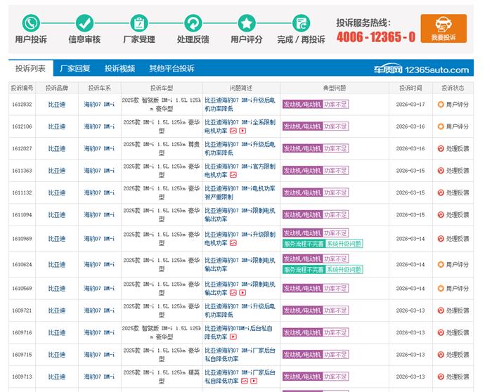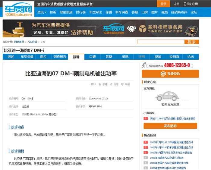 比亚迪海豹07 DM-i升级后电机功率降低,2025款海豹07 DMI官方公布的电机功率是160。以前测试时电机功率能达到130,现在却只能到93,我已经去4S店进行过测试,但厂家和4S店均未给出任何解决方案。类似的问题从关注车质网中了解到已经有不少车友反馈,希望厂家能够重视处理问题。