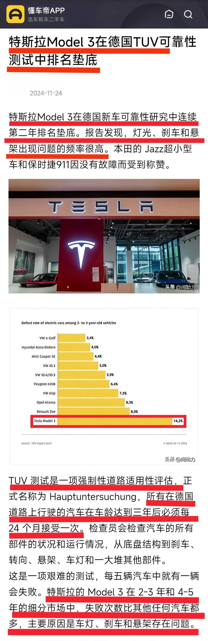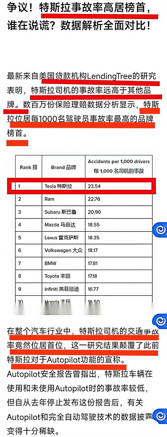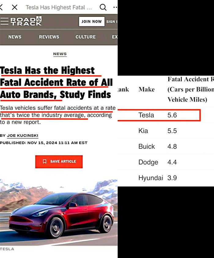 特斯拉事故率,致命事故率,故障率3个指标在几十个品牌里都是最高。根据美国,德国,丹麦等多个国家的官方或者权威机构数据或者根据官方数据得出的客观数据,或者车贷公司根据保险公司每年几千万份保险数据得出的客观数据,得出的事故率,致命事故率,故障率,保险赔付率4个指标5个数据,特斯拉在几十个品牌里都是最高。1.致命事故率:按品牌,特斯拉在几十个品牌里最高,是行业平均水平的2倍,跟优秀品牌差距更巨大。按车型:modelY是行业平均水平3.7倍,是某些优秀车型可能10倍左右。(致命事故率是美国Iseecars根据美国国家公路交通安全管理局5年内所有发生的死亡车祸得出的客观数据,美国官方从1975年开始记录每一起死亡车祸)。2.故障率(德国tuv车辆年检数据):前年特斯拉model3故障率14.7%,行业平均故障率为5.7%,model3故障率在所有检测的111款车中最高;去年,model3故障率14.2%,连续2年最高;今年,modelY故障率17.3%,行业平均故障率6.5%,modelY在100多款车中最高,并且打破10年来的行业记录。3.故障率(丹麦公路交通管理局车辆年检):model3故障率23%,电动车行业平均故障率为9%,特斯拉几乎行业平均水平的接近3倍。4.事故率(美国贷款机构Lendingtree根据美国保险机构数以千万份保险数据得出的客观数据):特斯拉连续多年几十个品牌里最高,是有些品牌的近2倍。5.保险赔付率:特斯拉连续多年几十个品牌里最高(越低越好):2024特斯拉美国保险赔付率103.3%,而美国车险行业平均赔付率66.1% 。6.整车扭转刚度:(抵抗外力变形能力,代表车身坚固程度,影响汽车安全性重要参数,越高越好):特斯拉几乎是同类型同价位电动车里最低之一 。根据德国tuv车辆年检,丹麦道路交通局的车辆年检,可以看出并不是所有电动车故障率都像特斯拉那么高,特斯拉故障率几乎是汽车行业或者电动车行业故障率的近3倍。根据车辆年检的故障率看出:特斯拉在刹车,悬挂,转向等问题突出。特斯拉只拿实验室里的碰撞测试成绩忽悠人,还有计算机模拟出的FSD避免了多少车祸,却不提FSD引起了多少车祸。另外,特斯拉还有广为诟病的反人类的单踏板模式。还有,用成本很的纯视觉FSD,还要收费6.4万元,割冤大头的韭菜!一般中国品牌的低配车型才用纯视觉方案,中国品牌的高端车一般都用激光雷达+毫米波雷达+视觉,成本更高,更安全。�纯视觉方案:光线弱,夜晚,雾霾,雨天,反光等环境下容易识别不了路面物体,就容易车祸。(特斯拉股东FSD开了不到100公里,就发生车祸。)还有,截止2025年11月27日,特斯拉网上被曝光的造成死亡的车祸772起(非官方数据),自动驾驶死亡车祸65起(没曝光的估计就更多了,这可能只是很小一部分,冰山一角而已),特斯拉一次死亡3人,4人,5人的车祸都数不清了。(国产品牌发生一起死3人的车祸就会被全国喷一年)。洋品牌,无非是利用人们崇洋媚外的思想,靠一个洋logo把稻草当成黄金来卖,攫取巨额利润!星链2次危险抵近中国空间站,严重威胁中国航天员生命安全!马斯克是美国五角大楼,美国空军,NASA,美国情报系统背后的白手套,小马甲,代理人。星链,星盾主要是军用的,而且主要是针对中国的,商用只是一部分。这就是为什么中国只禁止特斯拉这一个国外汽车品牌进入部队,重要党政机关,涉密国企,涉密科研院所,涉密部队医院,部分涉密机场,部分涉密高铁站等等。马斯克控制全球媒体,吹牛讲故事,制造话题,造神,搞精神殖民,培养崇洋媚外的大殖子!特斯拉销量,连续2年继续下跌!比亚迪全球销量接近特斯拉的3倍!(特斯拉主要靠国内崇洋媚外的特孝子了!特斯拉在德国也有超级工厂,但是在德国月销量低至800辆。)特斯拉2023全球销量180.9万辆,特斯拉2024全球销量178.9万辆,特斯拉2025全球销量163.6万辆。===============比亚迪2023全球销量302万辆,比亚迪2024全球销量427万辆,比亚迪2025全球销量460.2万辆。==============预计三年左右,小米汽车全球销量也会超越特斯拉。中国不但是全球最大的汽车生产国,也是全球最大的汽车出口国,2025中国汽车出口量约800万辆是第二名日本约400万辆的2倍!2025年10月中国占世界汽车份额38%,中国占世界新能源车份额75%!全球最好的电动车品牌,都在中国!不要再崇洋媚外了!