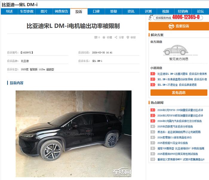 期,比亚迪宋L DM-i被曝电机输出功率受限,原标称160kW的电机,实际输出功率大幅下降,有的仅能输出98kW甚至更低,严重影响驾驶体验。车质网数据显示,众多车主投诉该问题,质疑比亚迪未经告知擅自限制功率,涉嫌侵犯知情权、公平交易权等。比亚迪应尽快回应并解决问题,恢复车辆原有动力性能。