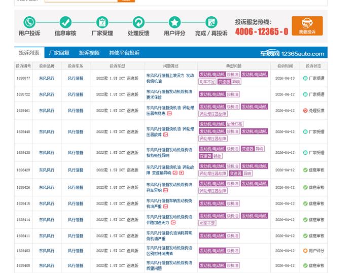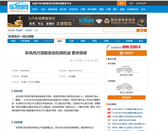 东风风行游艇发动机烧机油,自从购车均在特约服务站到店维修及保养,但说明书写每次保养加注机油3.5L,实际到店均加4L(一整桶),于2026年3月1日检查车辆时发现机油油位在下刻度线,询问风行服务站人员说估计需要大修。车友群讨论均反应3万公里左右开始烧机油,5万公里左右坏涡轮,已有部分车友进行处理,但要自费。购车时销售告知整车8年或16万公里质保,但实际质保按一般部件定义,只算3年质保。同样的问题在车质网中已经有不少车友反馈,要求厂家对烧机油和坏涡轮问题按宣传8年或16万公里进行质保。