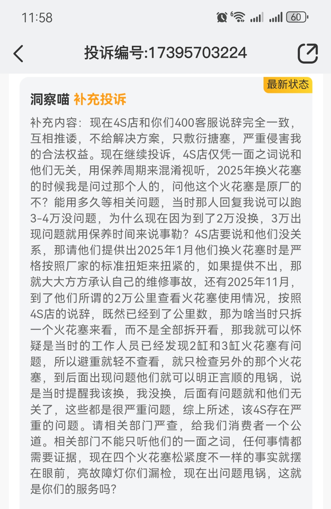 大众速腾车主。2025年1月和11月先后在该4S店做火花塞更换和保养,师傅安装或拆检火花塞后未按原厂标准扭矩紧固,导致火花塞松动。后续车辆出现故障灯亮,2026年3月到店检查,工作人员仅检查电瓶,未排查火花塞严重漏检。导致发动机故障。泸州**4S店和大众厂家互相推诿,拒不承担责任