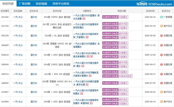 车辆一直断断续续出现漏水情况,顶棚、A柱、车内脚垫长期潮湿发霉,存在严重安全隐患与健康隐患。这个问题车质网上投诉很多。