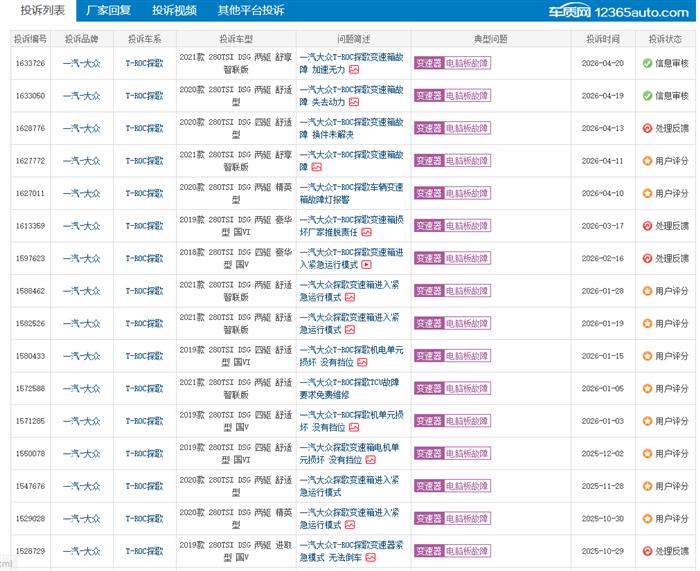 从车质网最新投诉信息来看,一汽大众 T-ROC 探歌近期变速箱、电脑板故障投诉持续扎堆,覆盖 19-21 款多个年款车型,问题高度集中。