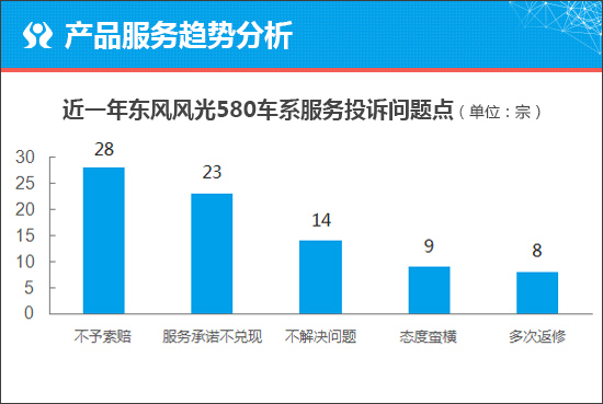 由于风光新580为换代车型,因此我们将通过对风光580车系近一年来的服务问题投诉情况进行分析。通过筛选风光580的投诉数据可以发现,投诉量相对较多的问题为“不予索赔”以及“服务承诺不兑现”,投诉量达到了28宗和25宗,而其它投诉问题点投诉量较低,且较为分散。