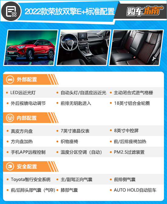 可以看到,即便是入门版车型,2022款一汽丰田RAV4荣放双擎E+依旧保持着较高的配置水平,像全LED大灯、前排无钥匙进入、真皮方向盘、后排座椅加热等舒适性配置均有配备。同时,2022款荣放双擎E+全系标配Toyota Safety Sense智行安全系统,拥有主动防碰撞、全速域自适应巡航等功能,可极大降低事故发生几率,让行车更加安全。此外,该车全车还搭载了共计10个安全气囊,能够极大程度保障全车乘客的安全。