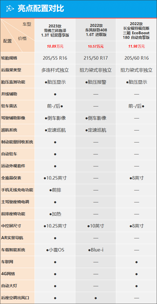客观来说,虽然同为紧凑型车阵营,但是相较于这两款竞品车型,科鲁泽的定位明显还是要更加“入门”一些,不仅车身尺寸更小,而且售价区间也更低。外观设计方面,科鲁泽颇为战斗激进,反观标致408以及福克斯,对于运动氛围的营造则并没有那么极致和纯粹。如果是更想彰显个性的年轻人,那么我想科鲁泽的设计肯定会更胜一筹,但是要论兼顾家用场景的话,那么拥有更大车内空间的标致408以及福克斯,无疑是要更“香”一些。