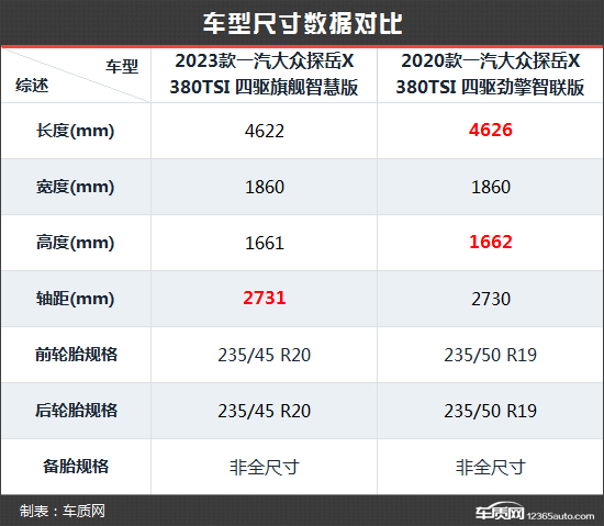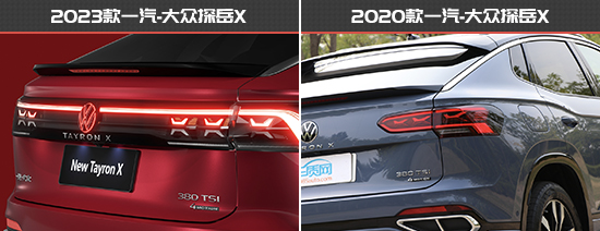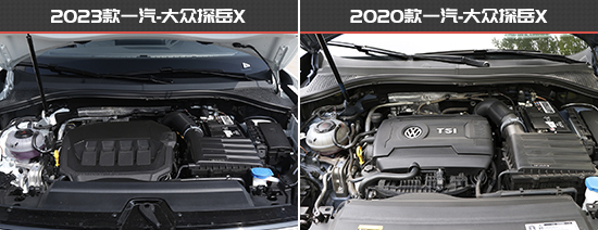 2023款一汽-大众探岳X整体风格没有太大变化,但通过对细节设计的调整,使其由内而外更具科技感。同时,新车的入手门槛也有所降低,车型数量由5款缩减至3款,主要取消了两款2.0T高功率版车型。本次进行对比车型为2023款一汽-大众探岳X 380TSI四驱旗舰智慧版和2020款一汽-大众探岳X 380TSI四驱劲擎智联版,由于两款车型价格相近,对比时更能直观地体现出差异。