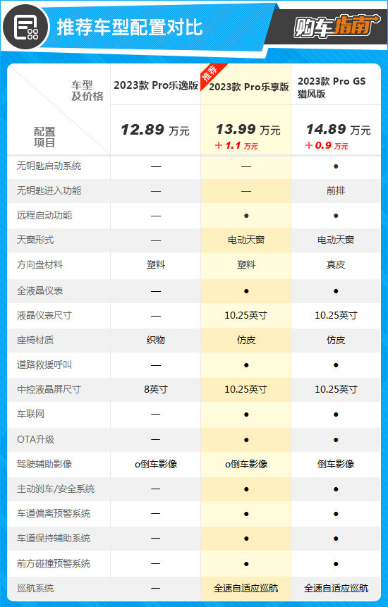 对于选购高配车型的消费者来说,小编更加推荐Pro 乐享版。对于一款家用轿车来说,消费者更加关注用车体验,而推荐车型配备了更加完善的多媒体系统。其中包括了车联网、OTA升级等功能,此外双联屏也增加了车内科技气息。在驾驶以及安全方面,该车还配有全速自适应巡航功能,在车道偏离辅助、主动刹车以及前方碰撞预警系统等加持下,令自身有了L2级自动驾驶的能力。总的来说,推荐车型在配置层面较低一级别车型有着大幅提升,价格也只是多出了1.1万元,可以说是物超所值。
