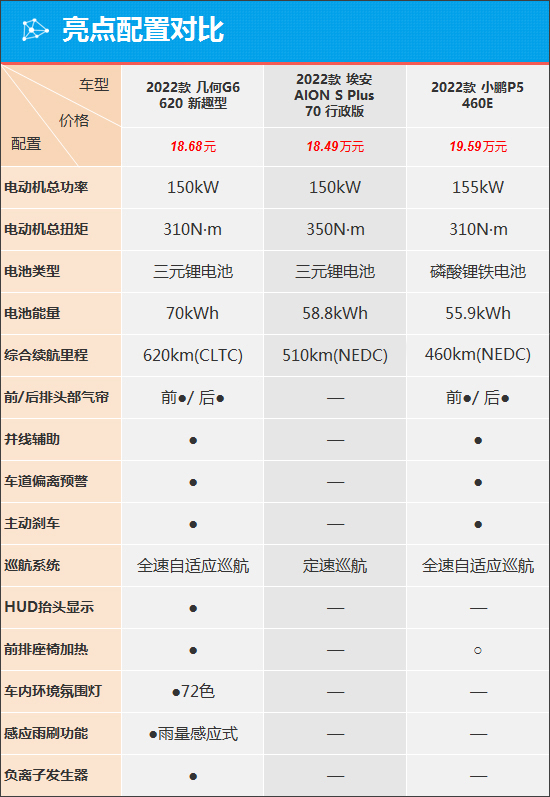 具体到车辆配置层面,所选车型在保证价格相近的前提下,差异较为明显。首先三款车型中仅有几何G6和小鹏P5配备了较为全面的主/被动安全配置,并且还提供了全速自适应巡航等时下热门功能,反观埃安AION S Plus虽然为标准续航版本,但并非最低配车型,主动安全配置的缺失确实有点令人意外。