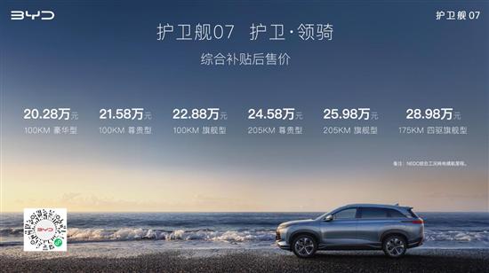 12月9日,比亚迪护卫舰07正式上市,此次共推出6款车型,售价区间为20.28-28.98万元。新车为海洋网旗下全新中型SUV,采用海洋美学设计理念,视觉效果大气时尚。动力上,新车全系搭载比亚迪超级混动技术,提供三种续航里程版本,分别为搭载DM-i的100KM、205KM款型以及搭载DM-p的175KM四驱款型。