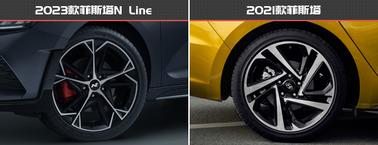由于搭载了全新的N Line套件,新款菲斯塔N Line的车身长度相比老款大幅增加30mm,其余参数则保持不变。侧面造型也延续了经典的轿跑风格设计,分段式腰线塑造出较强的肌肉感。新款菲斯塔N Line所配备的18英寸轮圈采用了N Line专属设计,更加复杂的结构以及银黑双色的样式看上去明显比老款更加精致。刹车卡钳依旧采用红色涂装,烘托出浓郁的运动氛围。