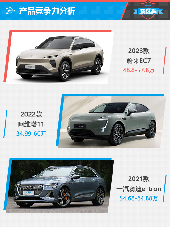 放眼望观纯电动SUV市场,虽然中大型SUV选择有很多,但溜背式中大型SUV可谓寥寥无几,其中前不久刚推出的阿维塔11算是主要竞争对手。此外,由于直接竞争对手较少,此次将传统豪强奥迪e-tron加入对比行列,其售价区间与蔚来EC7有所重叠,具有一定的竞争关系。