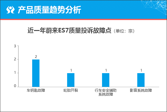 通过筛选蔚来ES7车型近一年的投诉数据可以发现,故障问题比较分散,包含“车钥匙故障”、“轮胎开裂”等,但投诉量均为个位数。通过进一步分析,上述问题绝大部分来自2022款车型。由于蔚来ES7也是去年刚刚推出的全新车型,因此同为NT2.0平台车型的蔚来EC7不排除会出现上述故障的可能。但实际情况如何,还有待其上市使用一段时间后才能有定论。