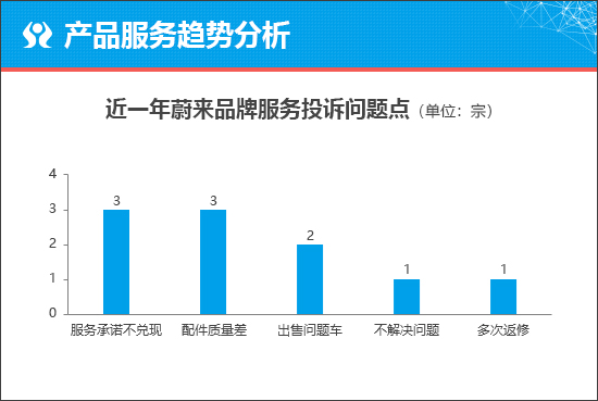 由于蔚来EC7为全新车型,因此我们将通过对蔚来品牌近一年来的服务问题投诉情况进行分析。通过筛选数据可以发现,“服务承诺不兑现”的投诉量相对较高。通过进一步分析可知,“服务承诺不兑现”问题主要集中在蔚来ES8车型上,但投诉量仅为个位数。