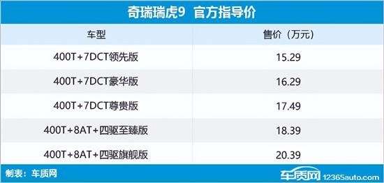 5月30日,奇瑞瑞虎9正式上市,本次上市共推出5款车型可选,售价区间为15.29-20.39万元。在购车政策方面,舒享金融礼、舒享定金礼、舒享置换礼、舒享质保礼、舒享流量礼以及舒享省心礼。