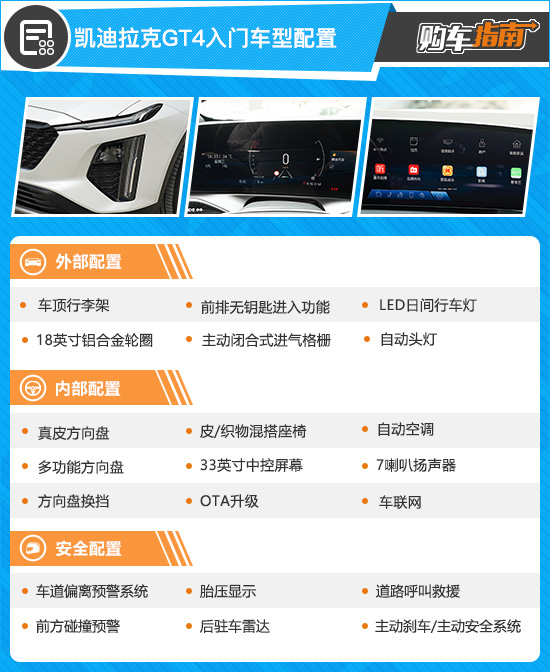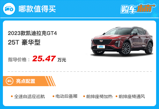 再向上的次顶配车型,同样是升级配置,但整体与推荐车型差距不大。而顶配车型,除了升级配置外,还搭载了2.0T发动机。其实凯迪拉克GT4的1.5T发动机已经属于高功率调校,最大输出已经达到了200Ps以上,对于这样一台紧凑型SUV来说,完全够用,没有必要再去升级到2.0T发动机。而配置层面,次顶配和顶配车型在推荐车型的基础上,更多也是加入一些锦上添花的配置,意义并不大。如果更多考虑性价比和实用性的话,推荐车型就是最合适的选择。综上,在凯迪拉克GT4全系车型中,25T 豪华型整体性价比最高,购车时可优先考虑。