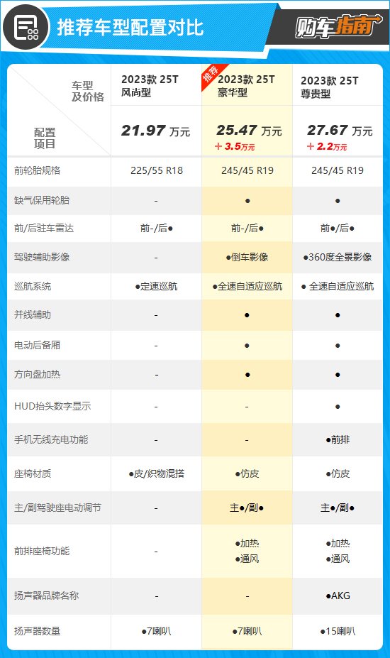 25T 豪华型是凯迪拉克GT4全系最推荐购入的车型,这台车型明显补齐了25T 风尚型在配置层面的短板,包括升级到了更大的19英寸轮圈,新增了前排座椅通风和加热、电动后备厢、主/副驾座椅电动调节、全速自适应巡航以及仿皮座椅等,皆为日常使用频次较高的配置,能明显提升用车体验。在这台车型上,才能开始感受到一台豪华品牌SUV应有的体验。综合来说,配置对应到价格物有所值,值得推荐。