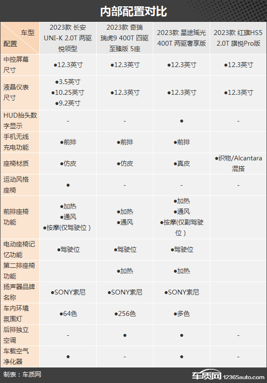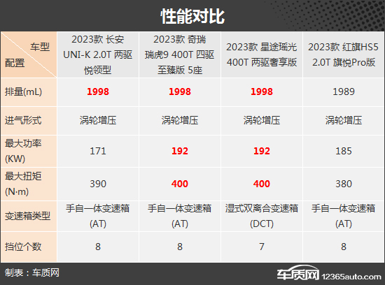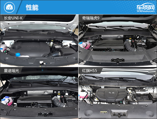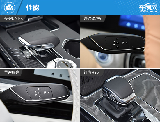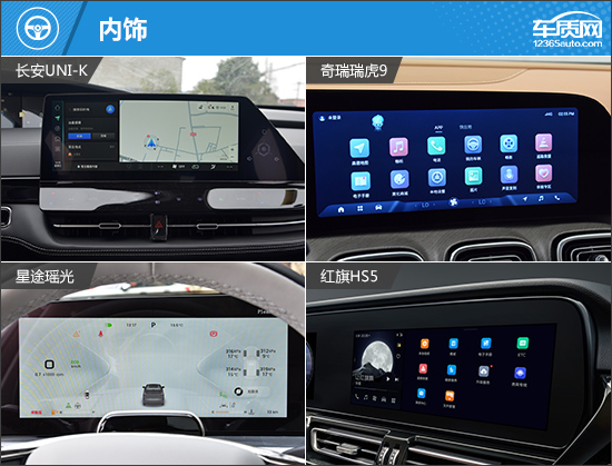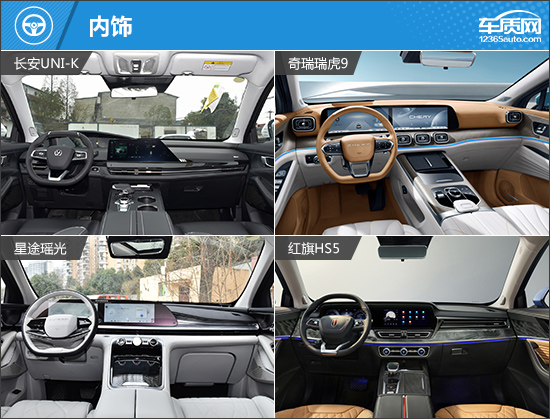 在内部配置上,四款车型的基础表现同样完善,例如液晶仪表、液晶中控屏幕、真皮多功能方向盘、主/副驾驶座椅电动调节以及自动空调等均有配备,满足日常使用不成问题。但是在进阶配置上,红旗HS5由于车型定位原因,明显处于落后地位。而其余三款车型总体来说差别不大,只是在配置上各有不同的取舍,且除奇瑞瑞虎9外,都有属于自己独享的配置,如星途瑶光独享HUD抬头显示、长安UNI-K独享运动风格座椅。