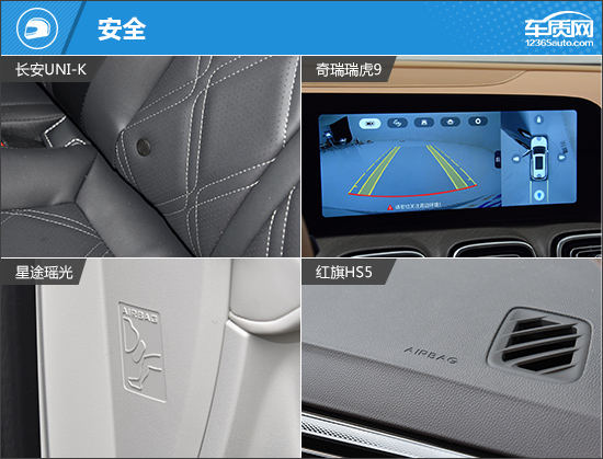 在安全配置方面,四款车型基础的主/被动安全配置比较完善,例如主/副驾驶安全气囊、前/后排头部气囊(气帘)等都有体现。在进阶配置上,星途瑶光最为出众,独享了同级别少见的膝部气囊和前排中间气囊。紧随其后的长安UNI-K也有不俗的表现,如DOW开门预警、前方碰撞预警、后方碰撞预警均有搭载。相比之下,作为旗舰车型的瑞虎9在安全配置方面略显逊色,而红旗HS5在进阶配置方面依旧不如其余三款车型。