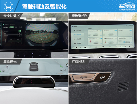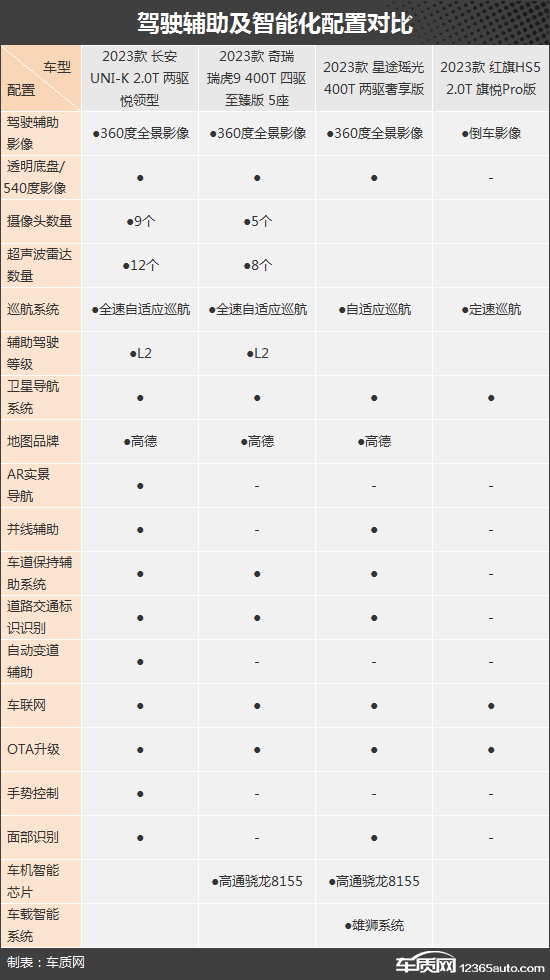 在智能化配置方面,四款车型都配备了车联网、OTA升级以及卫星导航系统,满足日常使用不成问题。在进阶配置方面,长安UNI-K和奇瑞瑞虎9均支持L2级辅助驾驶,并且长安UNI-K表现更丰富,独享AR实景导航、自动变道辅助功能,同时摄像头数量和超声波雷达数量更多。值得一提的是,奇瑞瑞虎9和星途瑶光还配有高通骁龙8155芯片,操作流畅度应该可以得到保证。反观红旗HS5来说,由于车型售价原因,整体表现稍显逊色。