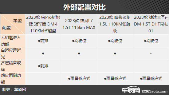 在外部配置方面,四款车型均为自主品牌车型,因此在配置上十分厚道,仅在细节上有所差异。具体来看,宋Pro新能源车型的无钥匙进入功能支持前排,并且配备了前排多层隔音玻璃,便利性和整车的静谧性更加出色。略有遗憾的是,宋Pro新能源车型也是本篇文章中唯一不提供雨量感应式雨刷的车型。此外,捷途大圣i-DM未提供自适应远近光功能,夜间行车安全性稍差一些。