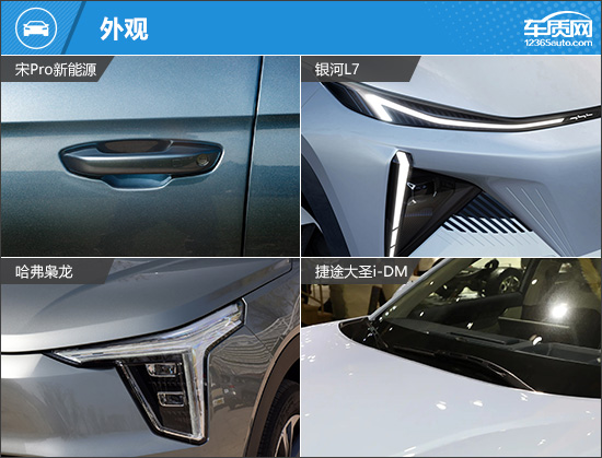 外观方面,四款车型均有着各自家族特点。其中比亚迪宋Pro新能源和捷途大圣i-DM的整体设计与传统的燃油车最为接近,二者均采用了大面积的前格栅。而银河L7和哈弗枭龙更贴合新能源车型设计,前脸上半部分为封闭式设计,进气口则设计在了车头下方。