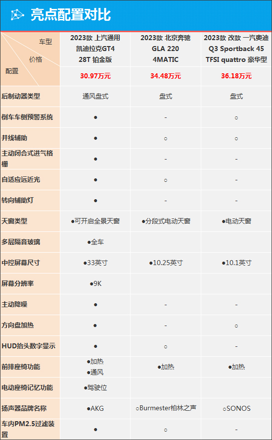 虽然奔驰GLA和奥迪Q3 Sportback的配置水平也不低,但相比之下,很多配置凯迪拉克GT4不用选装就可以获得,甚至在使用体验上更好,硬实力高下立判。只是不具备四驱系统以及相对较弱的品牌影响力,是凯迪拉克GT4无法规避的软肋。