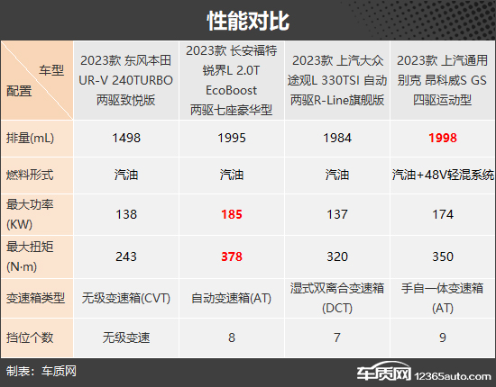 动力方面,四款车型中数据表现最优的是长安福特锐界L,185kW的最大功率和378N·m的最大扭矩,足以“吊打”其它三款车型。而燃料形式方面,上汽通用别克昂科威的汽油+48V轻混系统紧贴当下新能源浪潮,在行驶舒适性和燃油经济性方面会有不错的表现。当然,东风本田UR-V的1.5T发动机+CVT变速箱动力总成虽然平庸,但节能高效也是其优势之一。总体看来,四款车型在动力总成方面各有千秋,均为成熟可靠的动力总成。