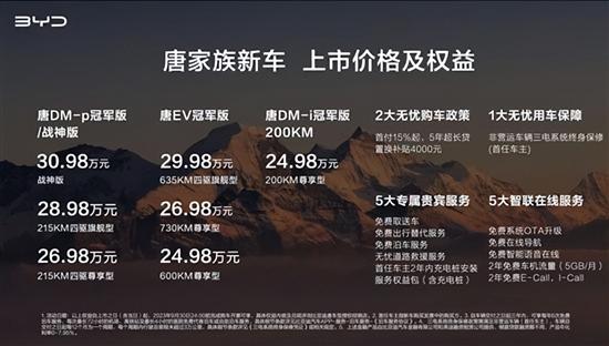 8月31日,新款比亚迪唐家族正式上市。此次共推出1款唐DM-i冠军版、3款唐EV冠军版、2款唐DM-p冠军版以及1款唐DM-p战神版,售价区间为24.98-30.98万元。作为改款车型,新车针对细节之处进行升级,并配备云辇-C智能阻尼车身控制系统和CCT舒适控制技术。