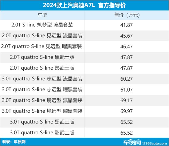 9月1日,车质网从上汽奥迪官方获悉,新款奥迪A7L正式上市,新车推出11款车型,售价为41.87-69.97万元。作为年度改款车型,新车主要针对价格和配置进行优化,其它方面并无太大的变化。