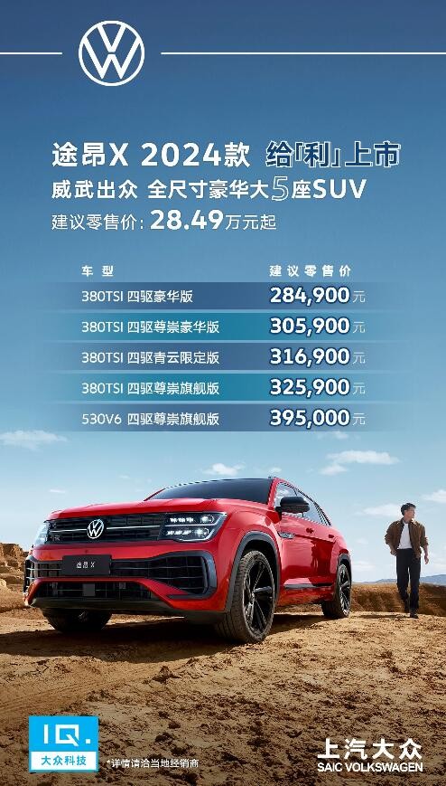 9月1日,2024款上汽大众途昂X正式上市,新车推出5款车型,售价区间为28.49-39.50万元。作为年度改款车型,新车针对动力方面做出了调整,取消了2.0T低功率发动机。
