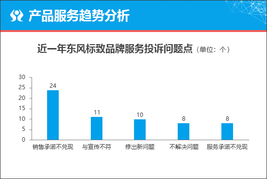 我们通过对东风标致品牌近一年来的服务问题投诉情况进行分析。通过筛选投诉数据可以发现,“销售承诺不兑现”投诉量稍高,具体分析来看,该问题主要集中在东风标致408车型上。