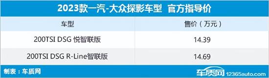2023年9月19日,一汽-大众官方宣布2023款探影正式上市,新车共推出2款车型,价格区间为14.39-14.69万元。作为改款车型,此次上市的2023款探影均搭载1.2T发动机,同时配置方面有所升级。