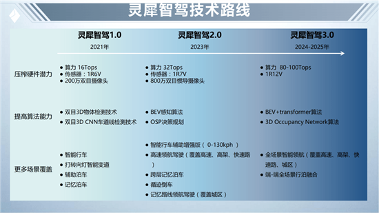 这套系统的智驾芯片来自于德赛西威,算力32Tops,相比目前主流的Orin-X,Mobileye Q5要差一点,和Mobileye Q4算力水平相当,从芯片算力上来说,不算顶级,但是对于这台车来说已经够用了,这也决定了宝骏云朵灵犀版在后续的功能完善上会存在天花板。根据规划,到2024年灵犀智驾3.0到来,不仅算力能够达到100Tops,而且算法也将升级为BEV+transformer算法,引入3D Occupancy Network算法,功能将完成全场景的智能领航辅助以及端对端的行泊融合。