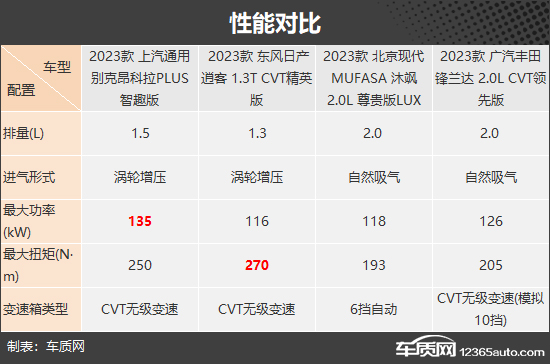 动力方面,上汽通用别克昂科拉PLUS和东风日产逍客均采用涡轮增压进气形式,北京现代MUFASA 沐飒和广汽丰田锋兰达则采用自然吸气进气形式,前者爆发感更强,后者平顺性更好。从参数上来看,上汽通用别克昂科拉PLUS的1.5T涡轮增压发动机最大功率最为出众。
