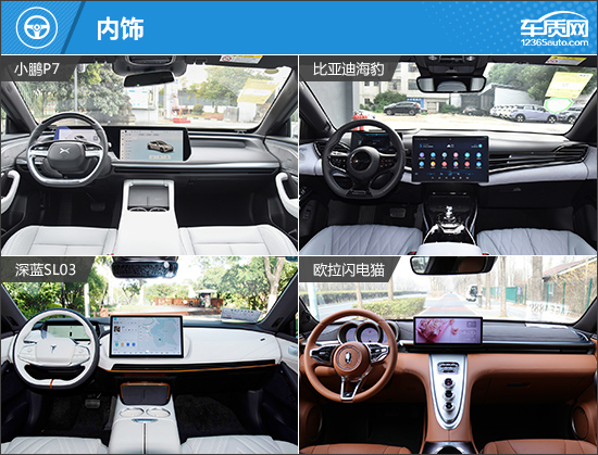 外观上,四款车可以说各具特色,且都有着较高的辨识度。其中小鹏P7的前脸和车尾都采用了贯穿式灯带,提升了整体视觉宽度;深蓝SL03、比亚迪海豹冠军版前脸样式较为夸张,运动气息十足。值得一提的是,深蓝SL03保险杠两端还配有“星语交互灯”,可对外显示车辆信息;欧拉闪电猫整体样式较为复古,圆润的车身以及前后椭圆形大灯,进一步吸引女性消费者的关注。