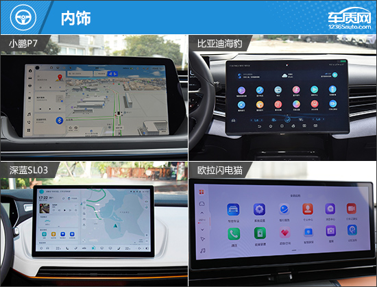 在内部,四款车设计都很简洁,其中小鹏P7采用了联屏设计,车内科技感营造更加到位,而其余三款车都采用传统的悬浮式中控屏。值得一提的是,深蓝SL03和比亚迪海豹冠军版的中控屏还支持旋转,科技感更出色。