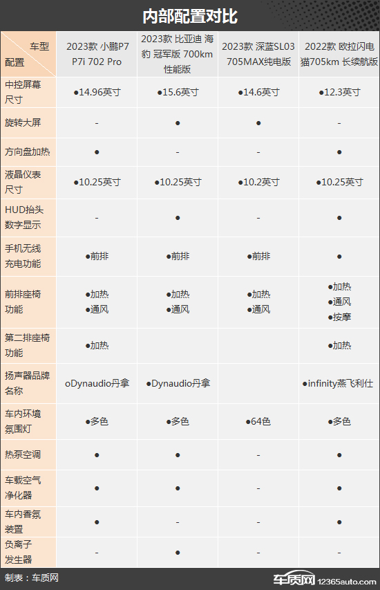 在内部配置方面,四款车型基础配置同样全面,丰富的前排座椅功能提升了前排乘客舒适度,同时,小鹏P7、欧拉闪电猫的后排座椅和方向盘还支持加热功能。在细节配置上,比亚迪海豹冠军版和欧拉闪电猫都搭载了HUD抬头显示和品牌音响;小鹏P7和欧拉闪电猫配备了车内香氛装置。相比之下,深蓝SL03与其它三款车型还有差距。