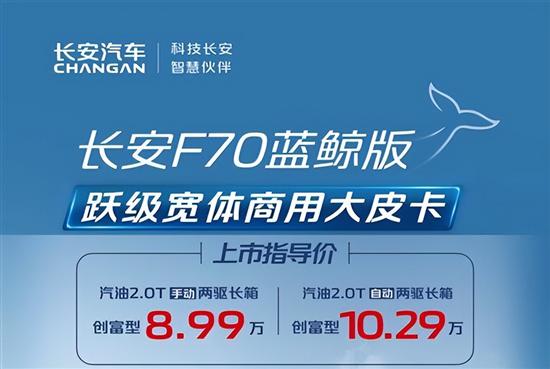 10月24日,长安品牌旗下全新皮卡车型——长安F70蓝鲸版正式上市。新车采用了偏家用风的设计,将搭载2.0T蓝鲸发动机。此次上市新车共推出2款车型,售价区间为8.99-10.29万元。