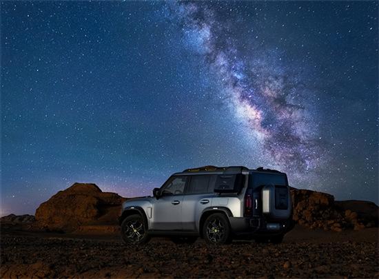 外观上,新车整体造型依旧保持不变,前脸熏黑进气格栅中带有可发光“JETOUR”徽标,搭配两侧矩形LED前灯组和下方宽大的前保险杠造型,看起来极具硬派风格。侧面采用了大量平直的线条设计,A/D柱进行了熏黑处理,配上大尺寸多辐式轮圈,整体运动感十足。尾部配有经典的“小书包”设计,使整车看上去更具越野气质。