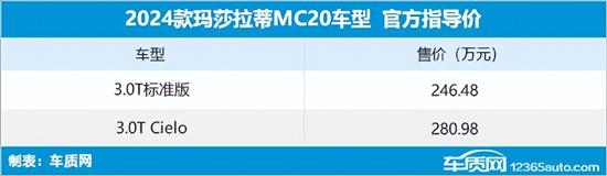 10月27日,2024款玛莎拉蒂MC20正式上市。其中,硬顶版车型售价为246.48万元;敞篷版车型售价为280.98万元。对比来看,两款配置车型价格较老款均有上调。