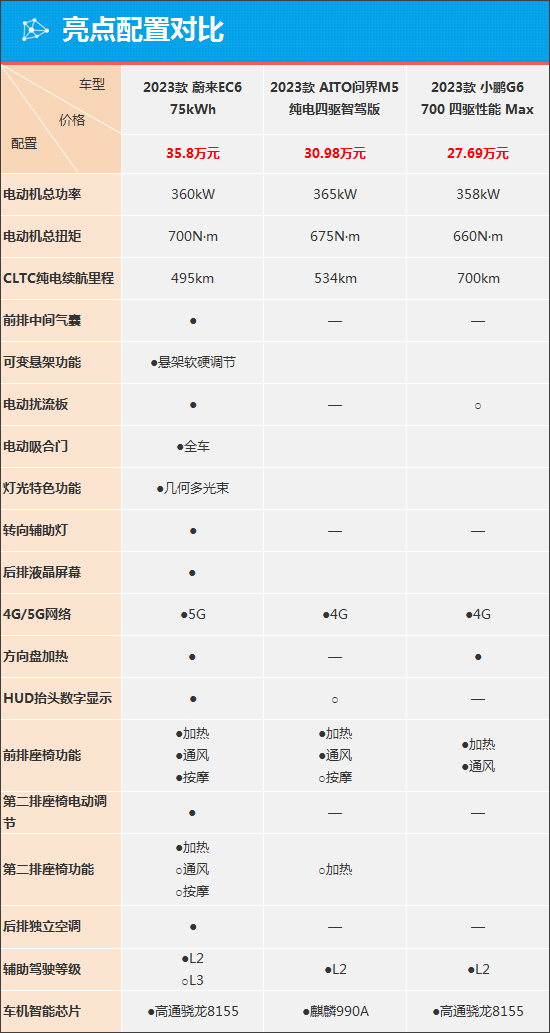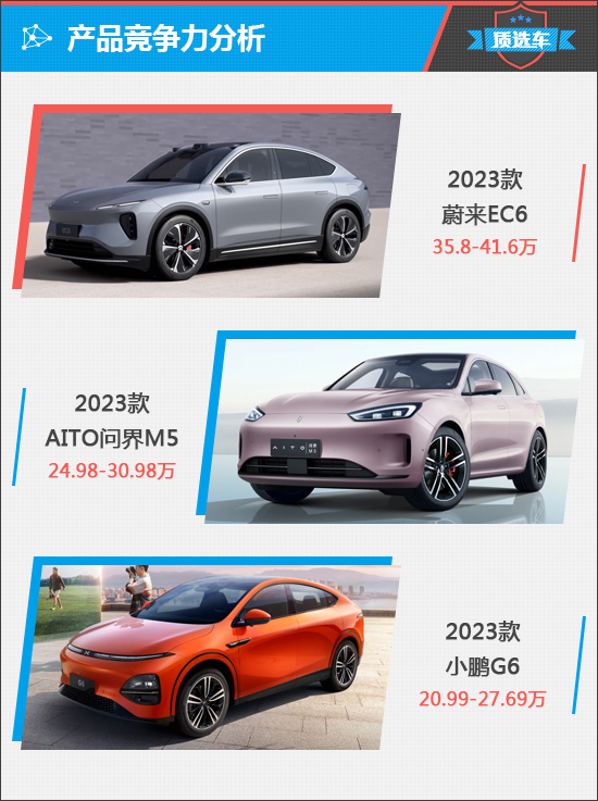 动力系统方面,蔚来EC6延续了蔚来品牌的传统,仅有两款车型,对应的电池组容量不同,但其余配置一致,并标配前/后双电机。AITO问界M5因为有增程式和纯电版两种动力总成,所以车型配置更多且价格区间跨度更大。小鹏G6则处于两者之间,分为单电机和双电机两个版本,车型数量和价格区间控制恰到好处。