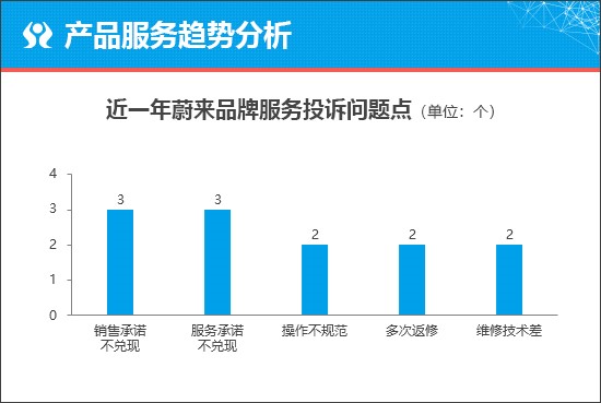 我们通过对蔚来品牌近一年来的服务问题投诉情况进行分析。通过筛选投诉数据可以发现,“销售承诺不兑现”和“服务承诺不兑现”投诉量稍高,具体分析来看,这两类投诉问题比较分散,蔚来品牌旗下多款车型均由所涉及。