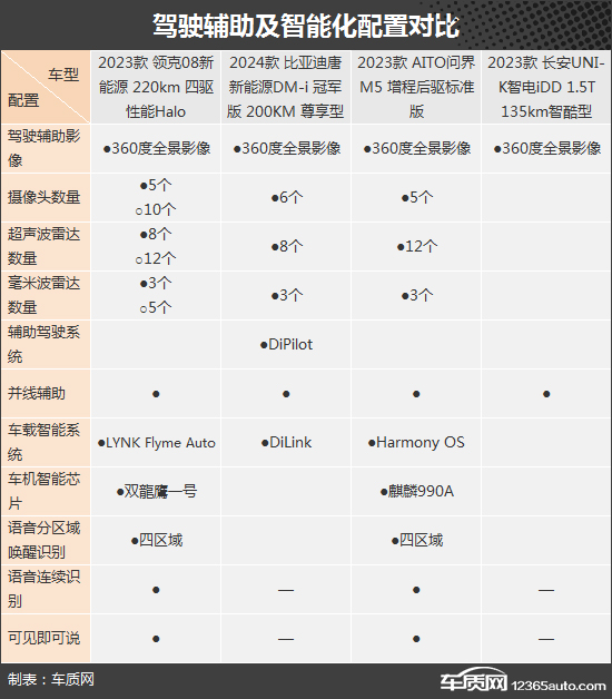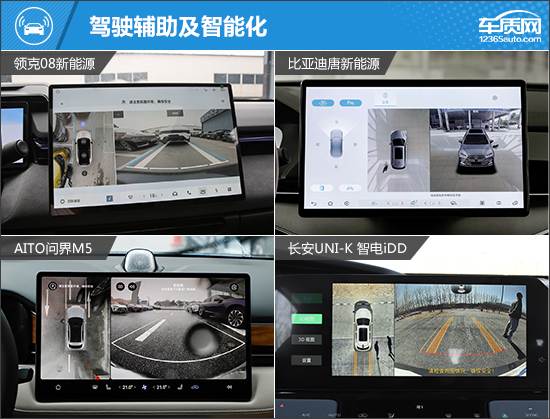 驾驶辅助系统方面,AITO问界M5标配了丰富的硬件配置,并且内置了Harmony OS操作系统,对于华为手机用户来说,在智能化体验上能更上一个台阶。而领克08新能源则提供了更多的摄像头以及雷达可供选装,并与AITO问界M5一样,支持四区域语音分区域唤醒识别、语音连续识别以及可见即可说等功能,便捷性和智能化程度更高。相比之下,长安UNI-K智电iDD在智能化配置中表现不尽如人意,与其他三款车型相比差距较大。