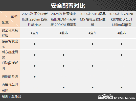 安全配置方面,四款车型表现各有取舍。其中,领克08新能源表现最为抢眼,独享了防侧翻系统这项配置,而其他三款车型在安全配置上缺失相对要多一些,如AITO问界M5未配备后方碰撞预警等。