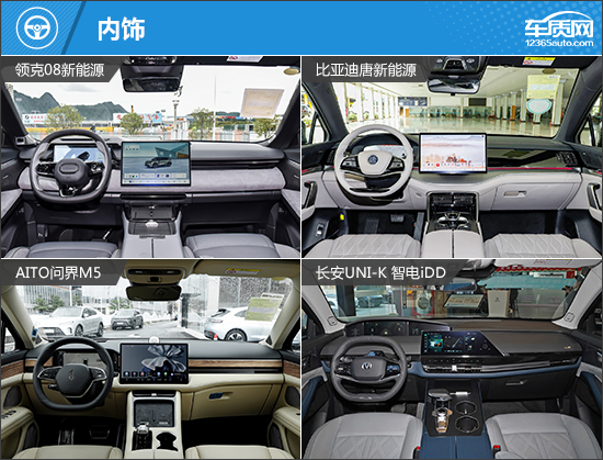四款车型内饰都不约而同采用了悬浮式多媒体触控屏设计,其中比亚迪唐新能源和长安UNI-K智电iDD均辅以高光黑色饰板装饰,效果更加年轻。而AITO问界M5提供了贯穿环抱式木纹饰板,看起来居家氛围浓郁。领克08新能源则提供了大量翻毛材质包裹,质感更出色。