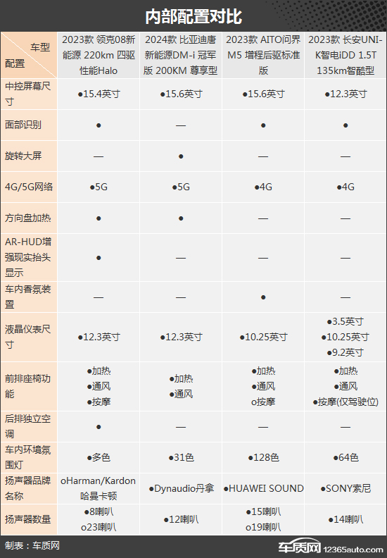 内部配置方面,四款车型都有着各自的特点。领克08新能源有着新颖且实用的AR-HUD增强现实抬头显示系统以及前排座椅按摩功能;比亚迪唐新能源则延续了自适应旋转pad功能,并提供了方向盘加热;AITO问界M5则有着提升车内氛围的车内香氛装置,128色车内氛围灯也是四款车型中可调范围最大的;此外,长安UNI-K智电iDD配备了三块屏幕组成的液晶仪表,同级别罕见,并且还有着独特的一体式运动座椅,支持前排座椅加热/通风,主驾驶位还提供了座椅按摩,加分不少。