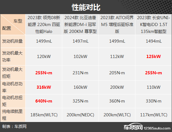 动力方面,此次推荐的四款车型中只有AITO问界M5采用了增程式动力系统,其余车型均为插电式混合动力,且均搭载了1.5T四缸发动机。从参数上来看,长安UNI-K智电iDD的燃油发动机最大功率数据要领先于其他三款车型;而领克08新能源的电动机总功率和总扭矩表现最为出众。此外,在纯电续航里程方面,比亚迪唐新能源和AITO问界M5均达到了200km,但两者标准并不一致,前者为NEDC,后者为WLTC。